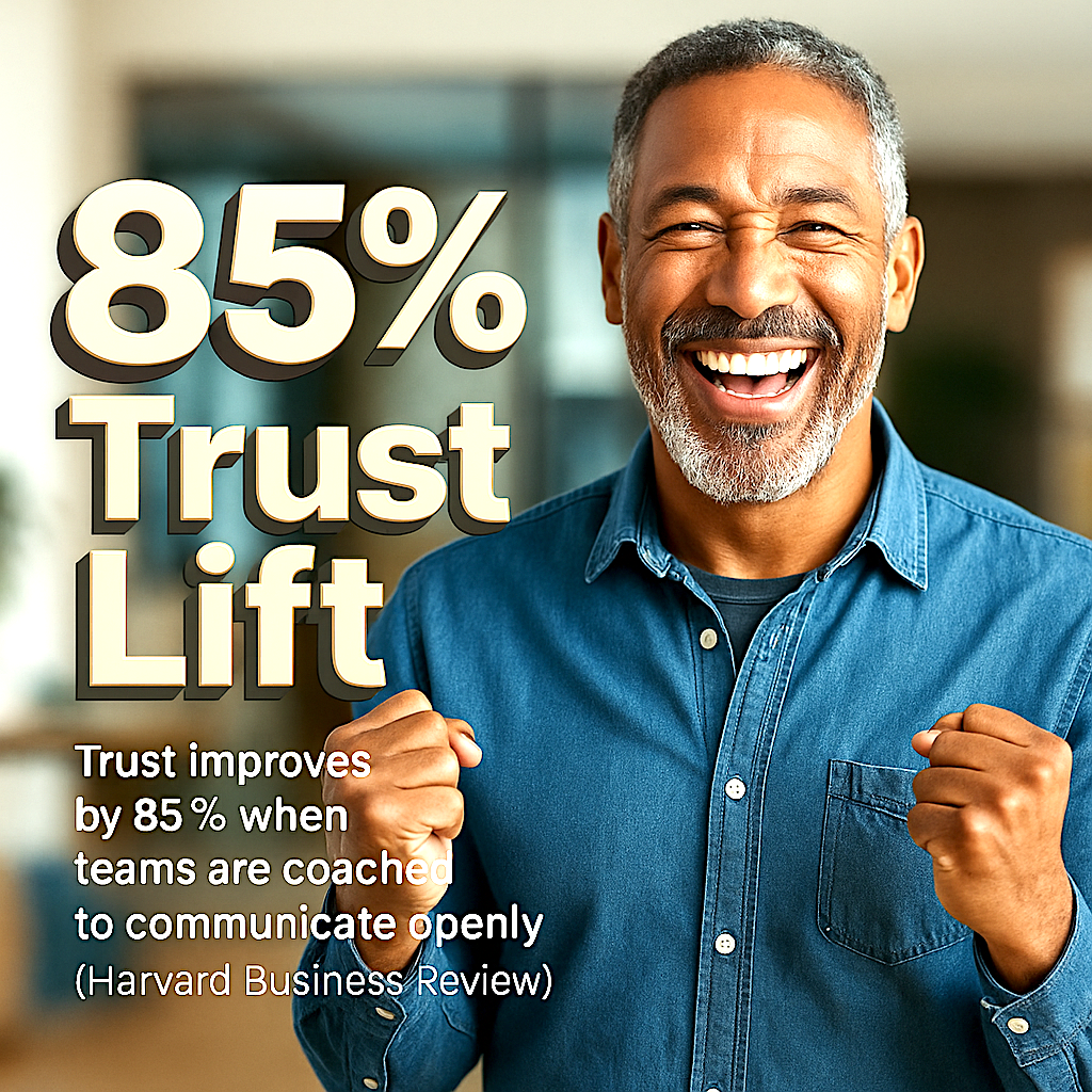 • 85% Trust Lift – Trust improves by 85% when teams are coached to communicate openly (Harvard Business Review).